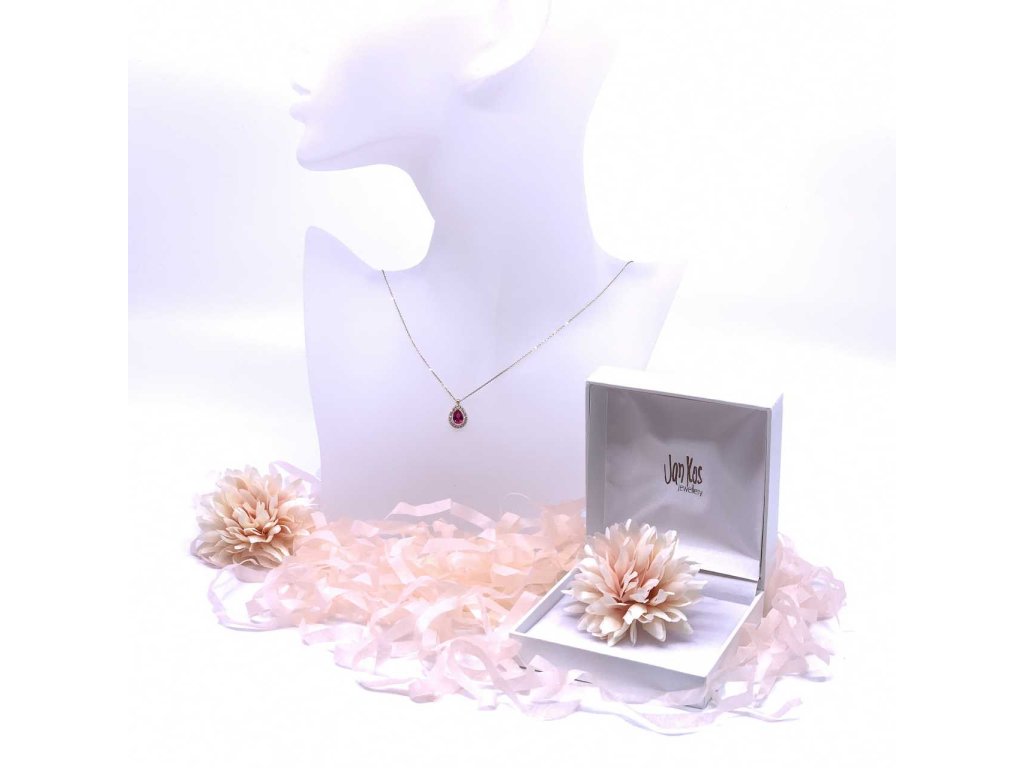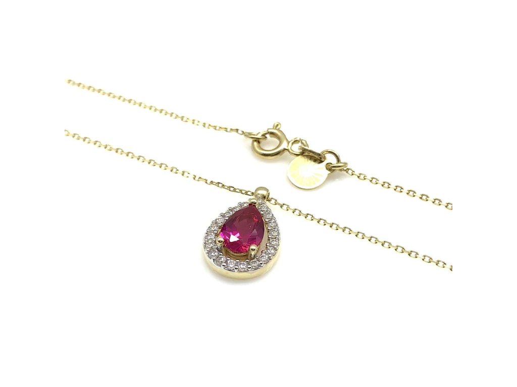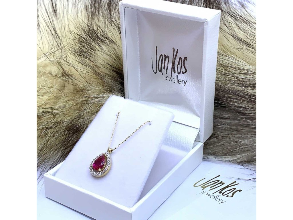 Krásný dámský řetízek s přívěskem ze žlutého zlata (585/1000) potěší každou ženu. Přívěsek má tvar kapky, která je vyplněná jedním větším centrálním červeným zirkonem, po obvodu jsou malé bílé zirkony. Řetízek je typu anker. Všechno naše zboží je označeno puncovními značkami, které jsou uznány Puncovním úřadem ČR.Doplňkové parametry