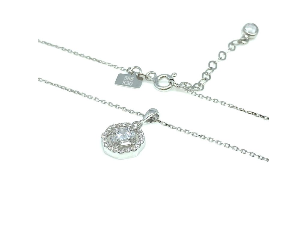 Moderní dámský řetízek s přívěskem z bílého zlata (585/1000) potěší každou ženu. Řetízek je typu anker a přívěsek je zdoben několika bílými zirkony. Povrchová úprava rhodiem zajistí šperku vyšší lesk a odolnost. Všechno naše zboží je označeno puncovními značkami uznanými Puncovním úřadem ČR.Doplňkové parametry