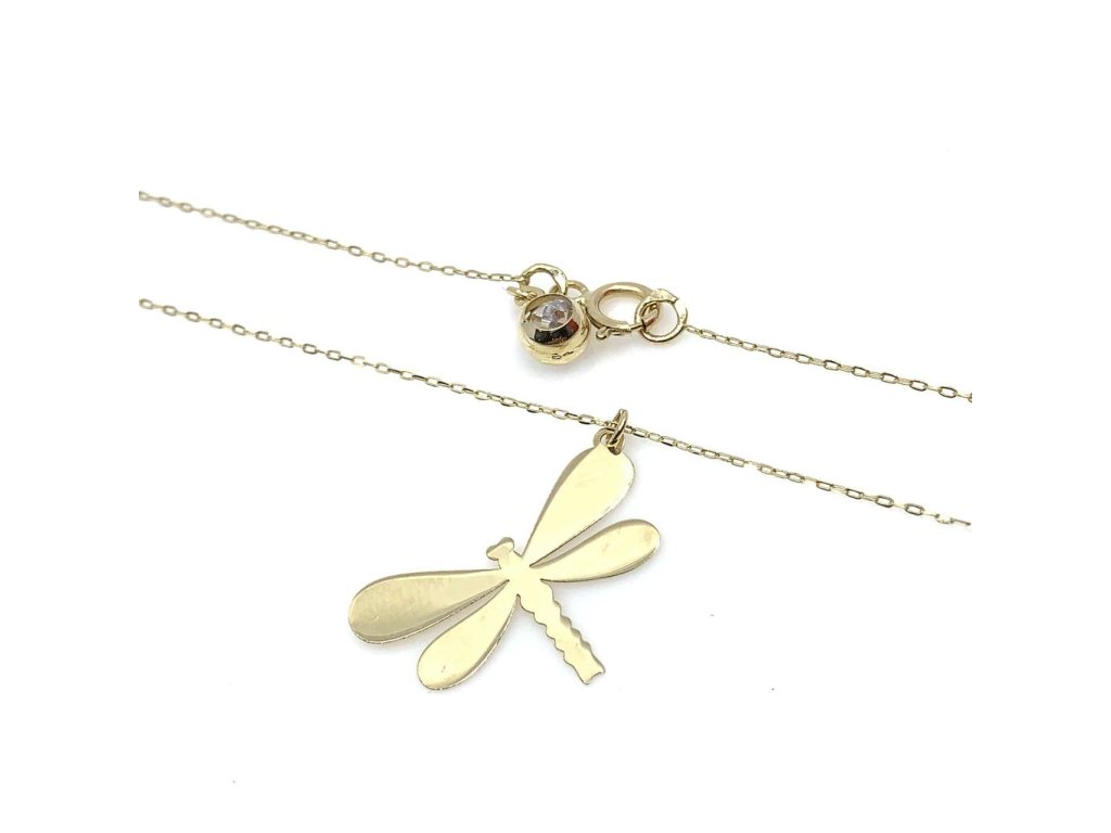 Krásný řetízek s přívěskem ze žlutého zlata (585/1000). Přívěsek má tvar vážky, který má hladký a lesklý povrch. Řetízek je typu anker. Všechno naše zboží je označeno puncovními značkami uznanými Puncovním úřadem ČR.Doplňkové parametry