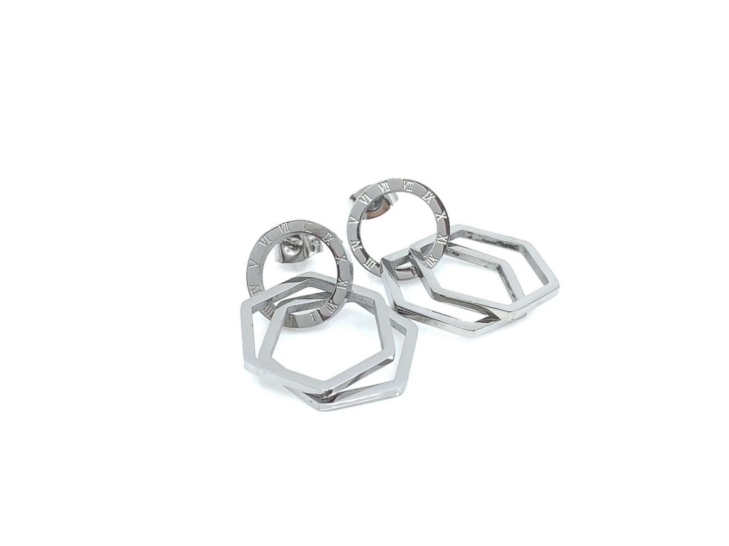 Dámské visací náušnice z oceli (316L). Mají tvar kolečka, které je zdobeno po obvodu římskými číslicemi. Kolečko je spojené se dvěma hladkými šestiúhelníky. Zapínání je na puzetu. Krásné náušnice pro speciální ženu.Doplňkové parametry