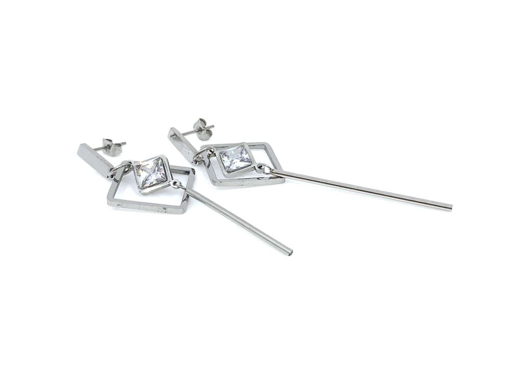 Dámské náušnice z oceli ( 316L ). Náušnice mají tvar dvou geometrických tvarů. Dvou hladkých obdélníků a kosočtverců, jeden je hladký a druhý má uprostřed bílý zirkon. Zapínání je na puzetu a jsou visací.Doplňkové parametry