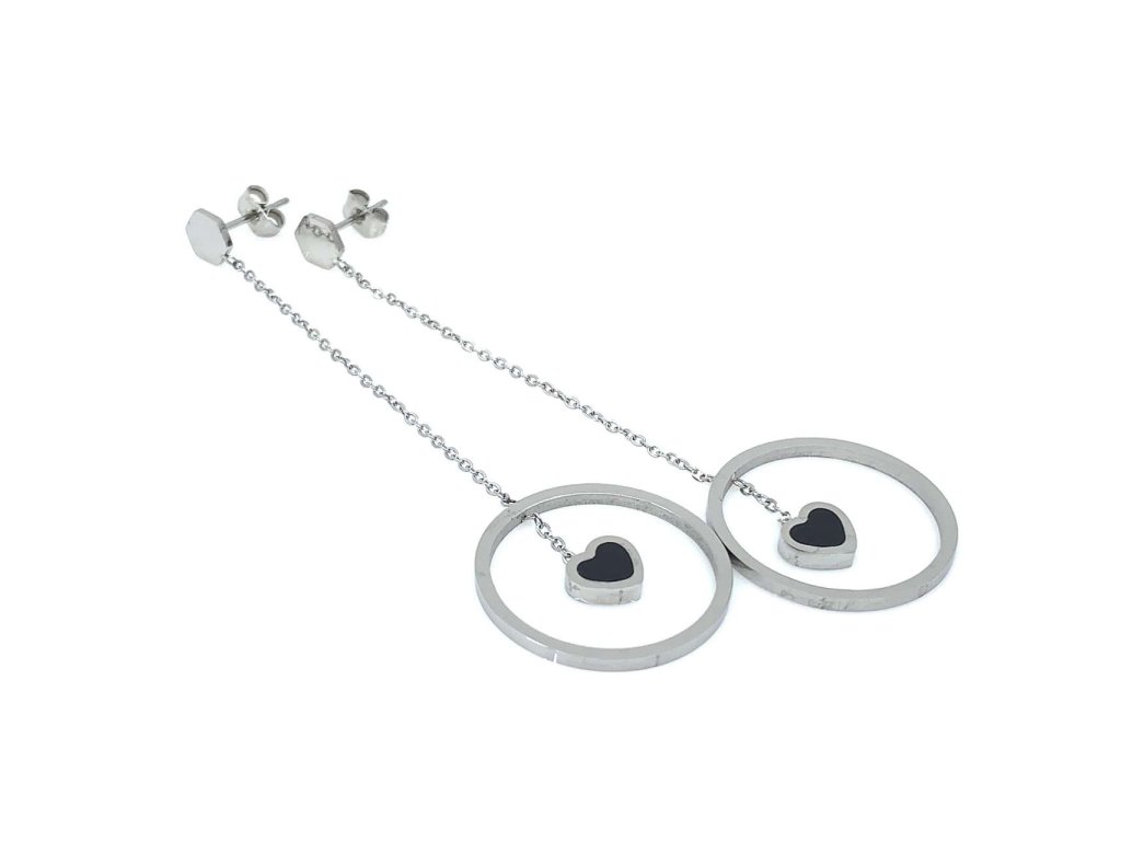 Krásné dámské náušnice z oceli (316L) zdobí řetízek typu anker a na konci kolečko, ve kterém je malé srdce černé barvy. Náušnice jsou visací a zapínání je na puzetu.Doplňkové parametry