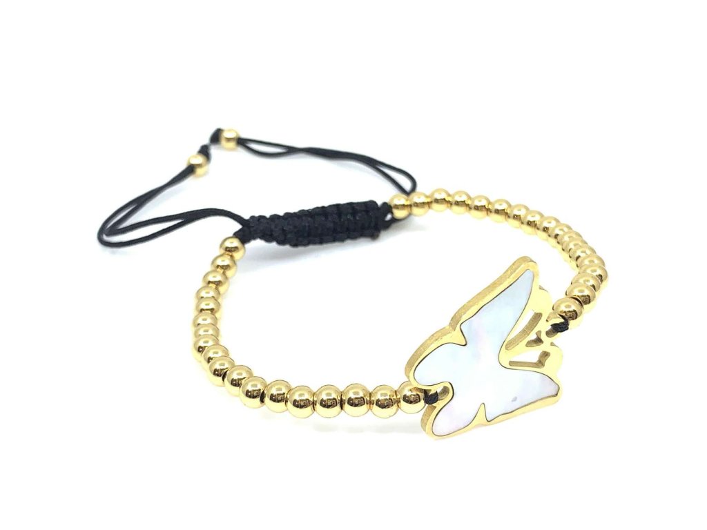 Dámský šňůrkový náramek z oceli (316L) má ozdobu ve tvaru motýla, který je zdoben perletí. Náramek je v délce zdobený korálky zlaté barvy. Šperk potěší ženu či dívku.Doplňkové parametry