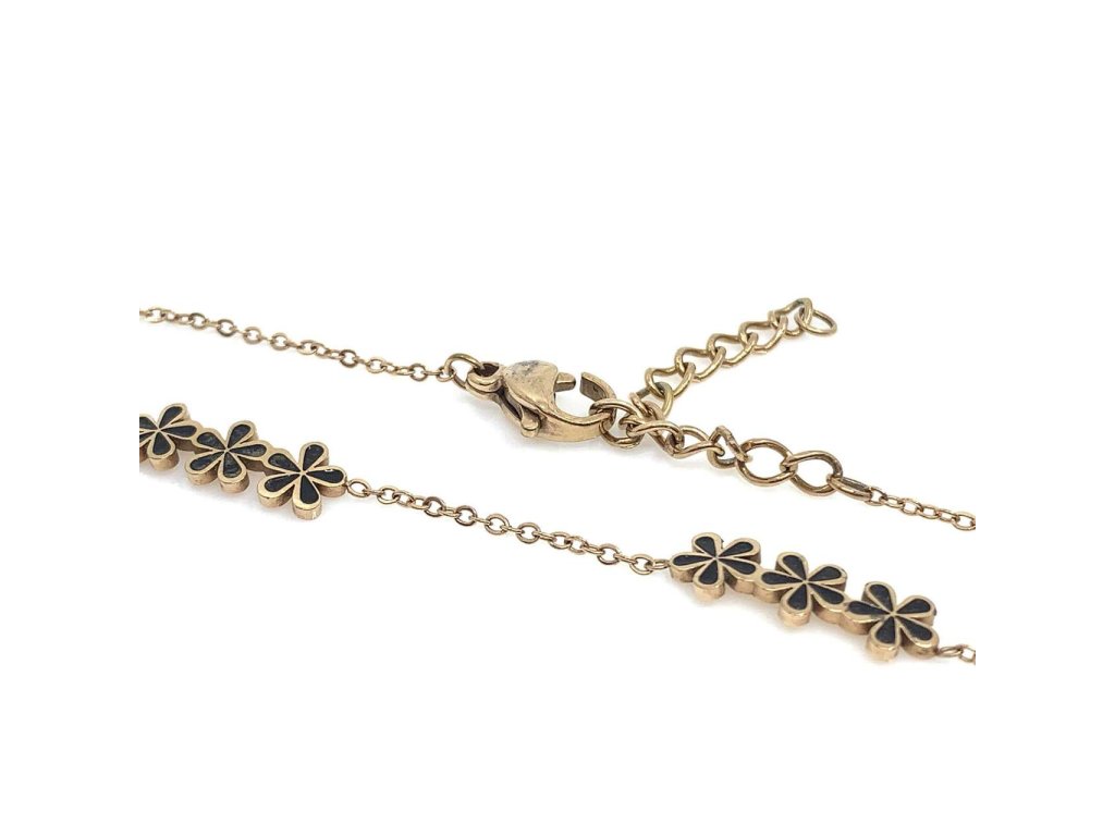 Dámský náramek s přívěskem z oceli (316L) pozlacený růžovým zlatem. Náramek má v délce dva přívěsky, které tvoří tři spojené květiny zdobené černým emailem. Šperk je v provedení velkého lesku. Skvostný šperk pro výjimečnou ženu.Doplňkové parametry