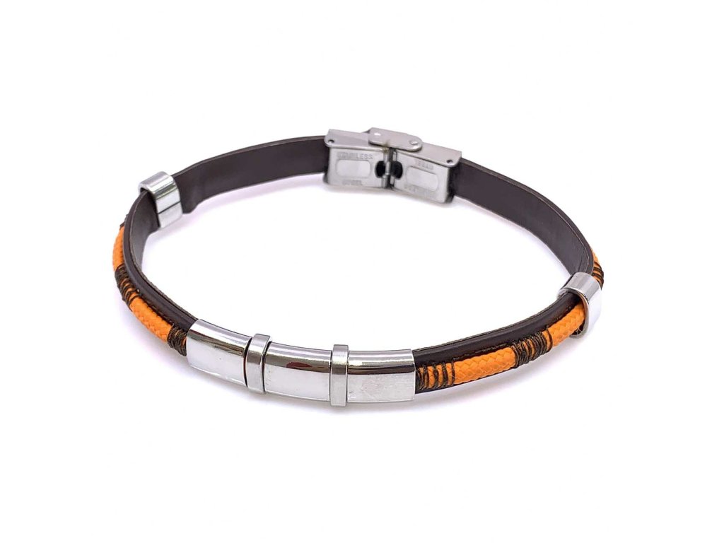 Krásný pánský kožený náramek se zapínáním z oceli (316L). Náramek je z hladké hnědé kůže s látkovou šňůrkou v oranžové barvě . Ozdoba je ve tvaru hladkého obdélníku .Neobyčejný šperk pro neobyčejného muže.Doplňkové parametry