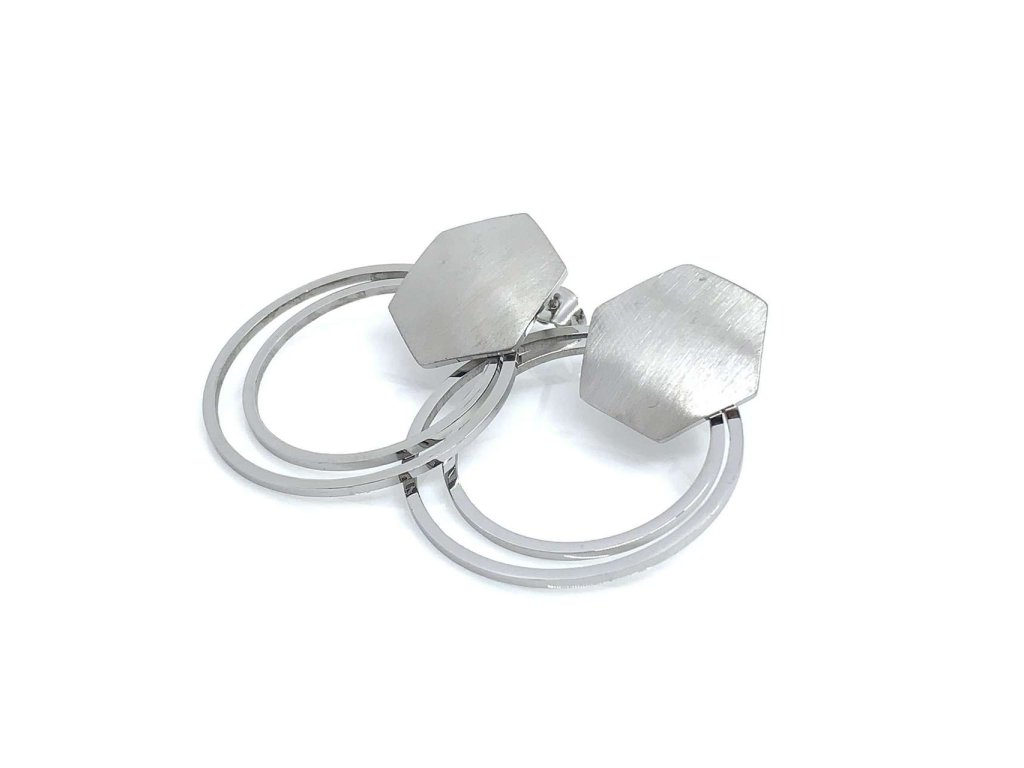 Dámské visací náušnice z oceli (316L) zdobí hladký šestiúhelník a dvě spojená kolečka, která jsou v provedení velkého lesku. Zapínání je na puzetu. Náušnice pro výjimečnou ženu.Doplňkové parametry