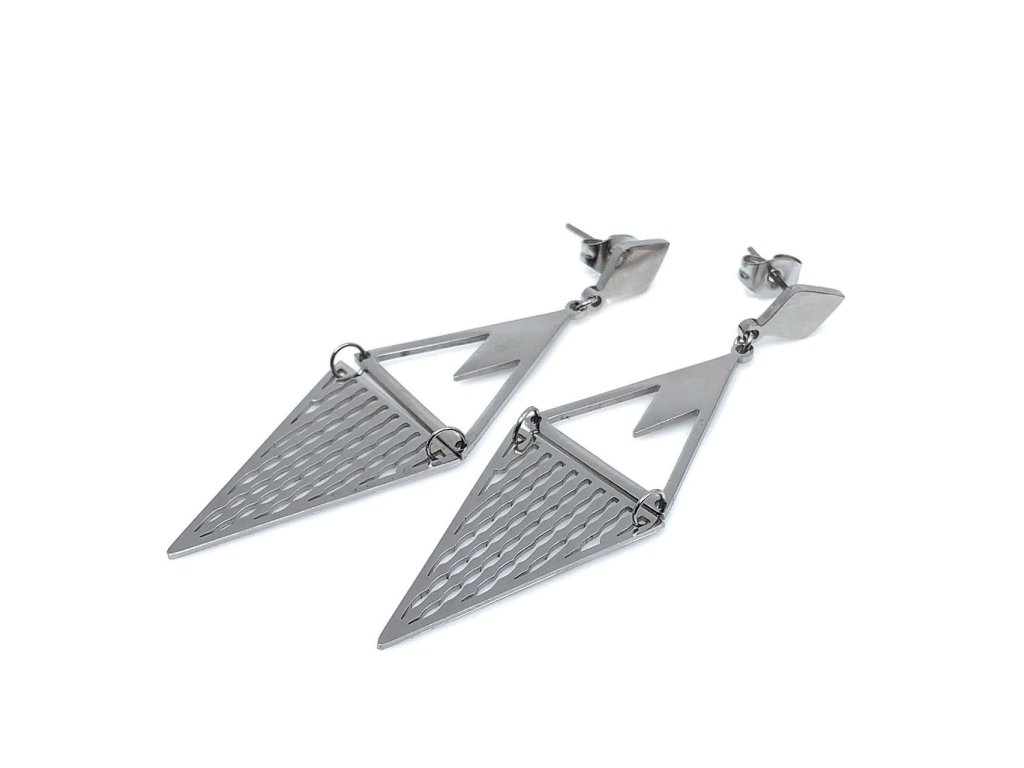 Atraktivní dámské náušnice z oceli (316L), originální a stylové naušnice s nimiž zaujmete pozornost Vašich přátel. Naušnice jsou zapínací na puzetu. Tvar malého kosočtverce, pod kterým jsou protisobě visací, vyřezávané trojúhelníky.Doplňkové parametry