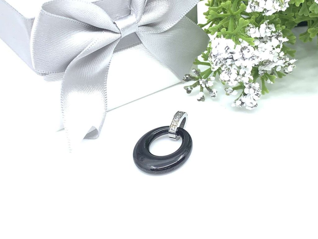 Stylový dámský přívěsek z oceli (316L). Má tvar oválu s průřezem a je tvořen z černé keramiky. Očko přívěsku je zdobené bílými zirkony.Doplňkové parametry