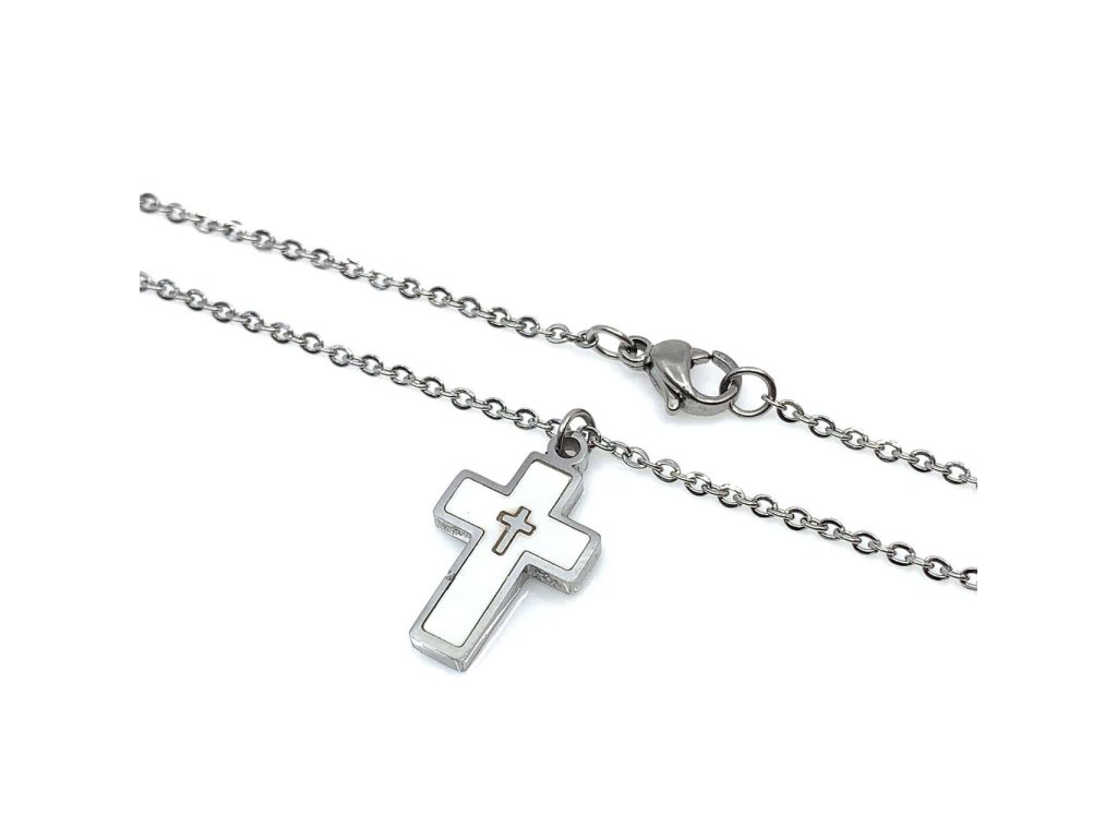 Originální řetízek s přívěskem z oceli (316L). Působivý řetízek s přívěskem ve tvaru kříže, který je zdobený vyplněnou perletí a malým křížkem z oceli v jeho středu. Řetízek je typu anker.Doplňkové parametry