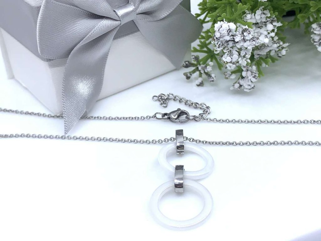 Moderní dámský řetízek s přívěskem z oceli (316L) s nastavitelnou délkou. Řetízek je typu anker. Přívěsek tvoří dvě kolečka s průřezem, která jsou z bílé keramiky.Doplňkové parametry