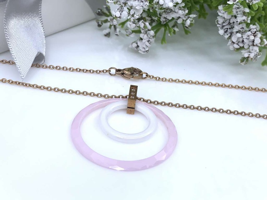 Zajímavý dámský řetízek s přívěskem z oceli (316L). Řetízek je typu anker a je pozlacený do růžové barvy. Přívěsek je ve tvaru dvou koleček, jedno je z růžové keramiky a druhé z bílé keramiky. Očko přívěsku je zdobené drobnými bílými zirkony.Doplňkové parametry