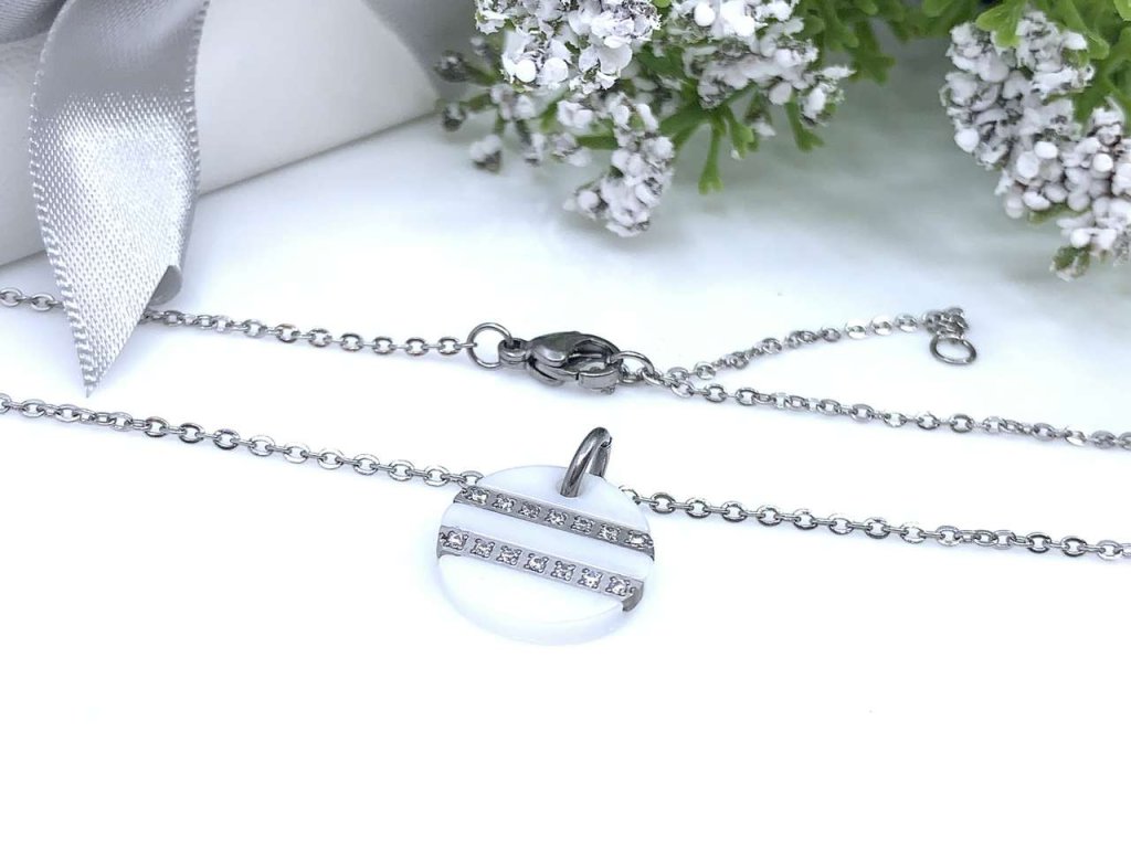 Stylový dámský řetízek s přívěskem z oceli (316L) s nastavitelnou délkou. Řetízek je typu anker. Přívěsek je ve tvaru kolečka z bílé keramiky, které jsou je zdobené dvěma řadami bílých zirkonů.Doplňkové parametry