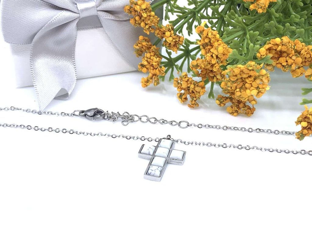 Nádherný dámský řetízek s přívěskem z oceli (316L) s nastavitelnou délkou. Řetízek je typu anker. Přívěsek má tvar kříže, který je zdobený bílou keramikou.Doplňkové parametry