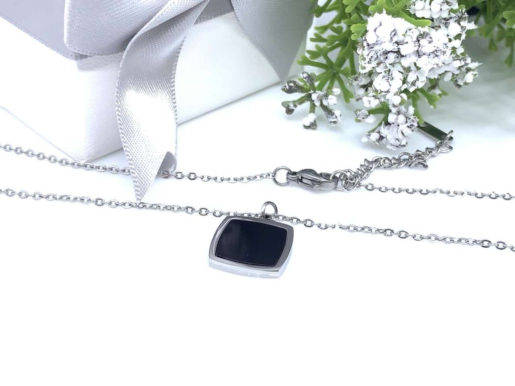 Moderní dámský řetízek s přívěskem z oceli (316L) s nastavitelnou délkou. Řetízek je typu anker. Přívěsek má tvar čtverce, který je vyplněný černou keramikou.Doplňkové parametry