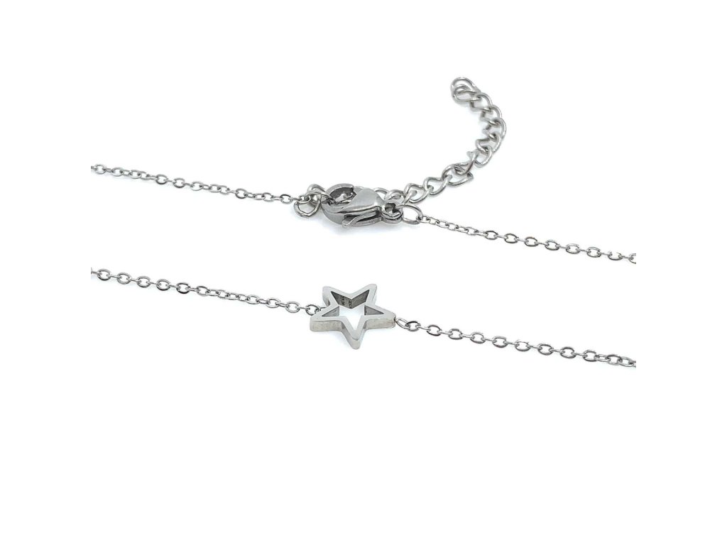 Krásný dámský řetízek s přívěsky z oceli (316L). Přívěsky mají tvar hvězdy a zirkonů v hladké obrubě a jsou uchycené v celé délce řetízku. Řetízek je typu anker. Šperk pro speciální ženu či dívku.Doplňkové parametry