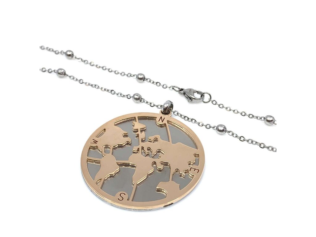 Nádherný řetízek s přívěskem z oceli (316L) potěší i náročnou ženu. Řetízek je typu anker , zdobený kuličkami v delším provedení s přívěsem s motivem mapy světa, který je zdobený zlacením.Doplňkové parametry