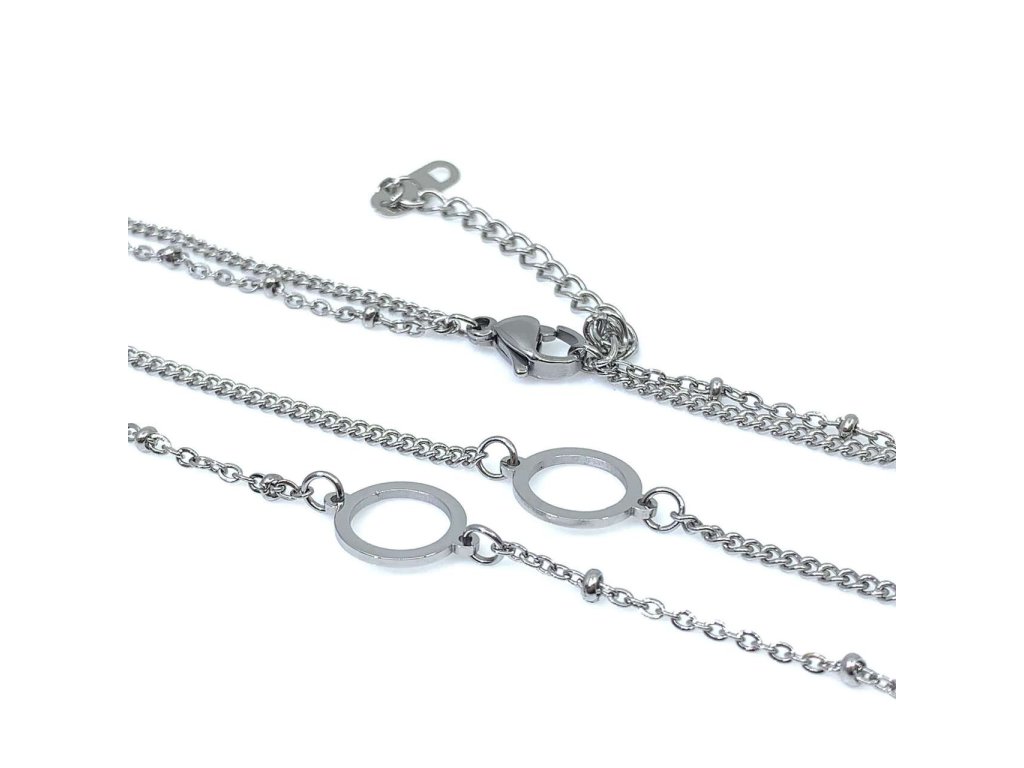 Pěkný řetízek typu anker s přívěskem z oceli ( 316L). Několik přívěsků má tvar obrysu kolečka. Řetízek je dvojitý a zdobený malými ocelovými kuličkami. Zajímavý šperk pro vyjímečnou ženu.Doplňkové parametry