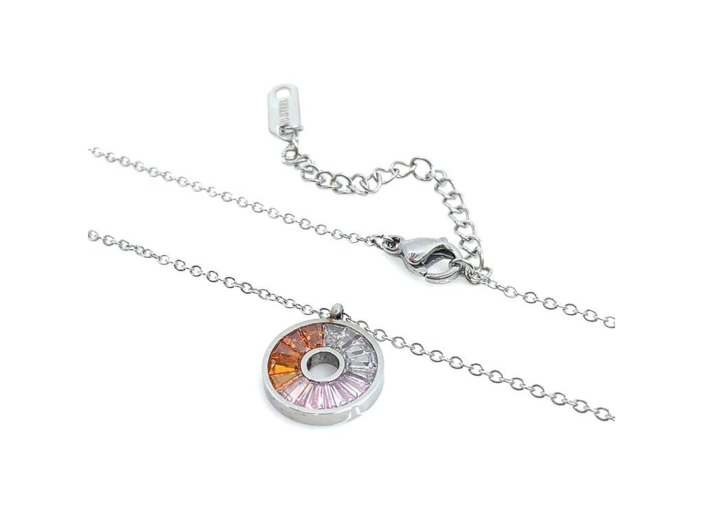Elegantní řetízek s přívěskem z oceli ( 316L) s nastavitelnou délkou. Kulatý přívěsek je osázen bílými, růžovými a oranžovými zirkony. Nápaditý šperk pro ženu či dívku, která je pro Vás speciální.Doplňkové parametry