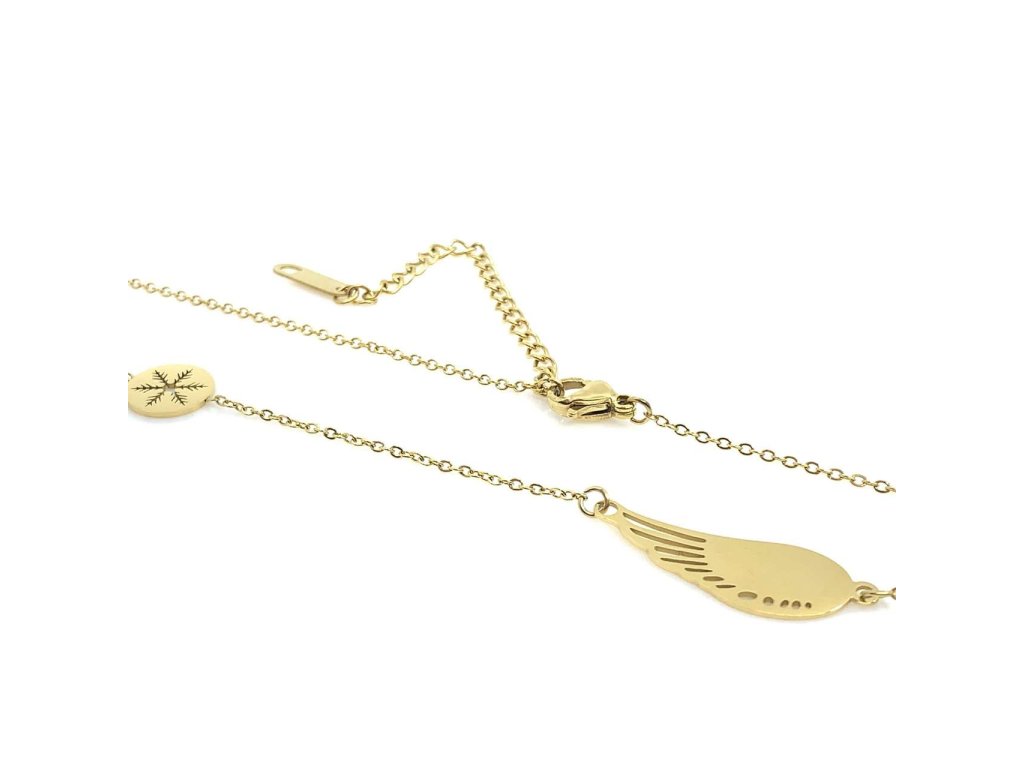Něžný pozlacený řetízek s přívěsky z oceli ( 316L) s nastavitelnou délkou. Řetízek má v délce uchycené celkem tři přívěsky, dva jsou kulaté s motivem sněhové vločky a třetí je v provedení andělského křídla. Šperk je v provedení velkého lesku. Podtrhněte svůj přirozený půvab kouzelným šperkem.Doplňkové parametry
