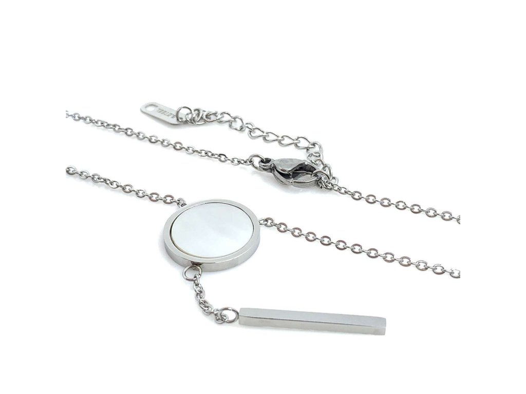 Elegantní řetízek s přívěskem z oceli ( 316L) s nastavitelnou délkou. Přívěsek je kulatý, uvnitř vyplněný perletí a pod ním je na krátkém řetízku ochyn obdélník z oceli. Šperk je v provedení velkého lesku. Decentní šperk pro každou příležitost.Doplňkové parametry
