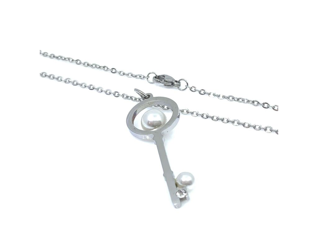 Krásný řetízek s přívěskem z oceli ( 316L). Přívěsek má tvar hladkého klíče, který je ozdoben dvěma perlami a jedním malým bílým zirkonem. Řetízek je typu anker.Doplňkové parametry