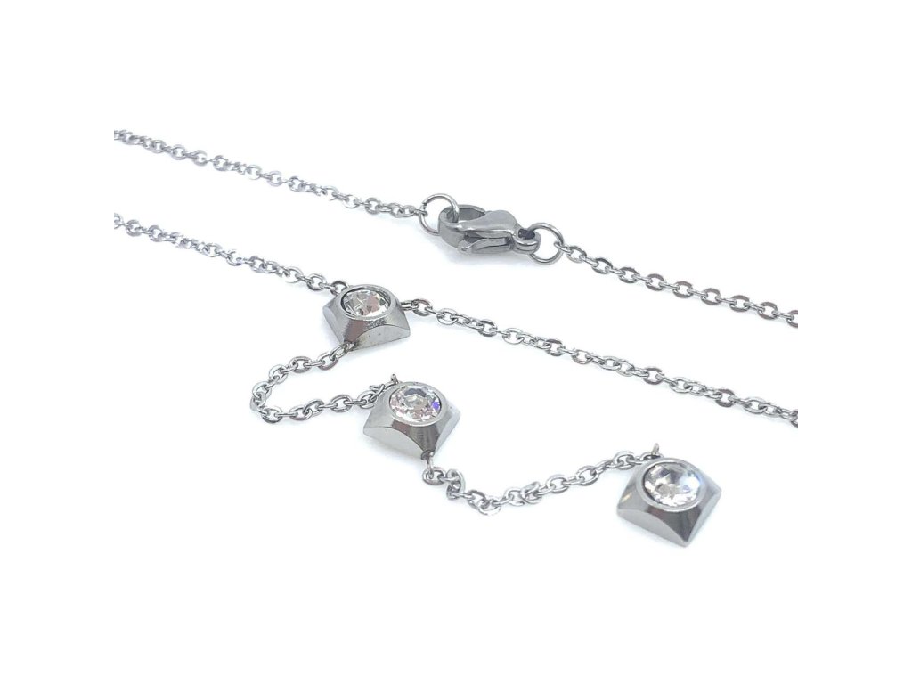 Trendy řetízek s přívěskem z oceli ( 316L) v délce 45 cm. Přívěsek je tvořen že tří kosočtverců osázených bílým zirkonem, které jsou propojeny krátkým řetízkem. Přívěsek tak krásně zvýrazní dekolt. Ozdobte se šperkem, který zvýrazní Vaší ženskost.Doplňkové parametry
