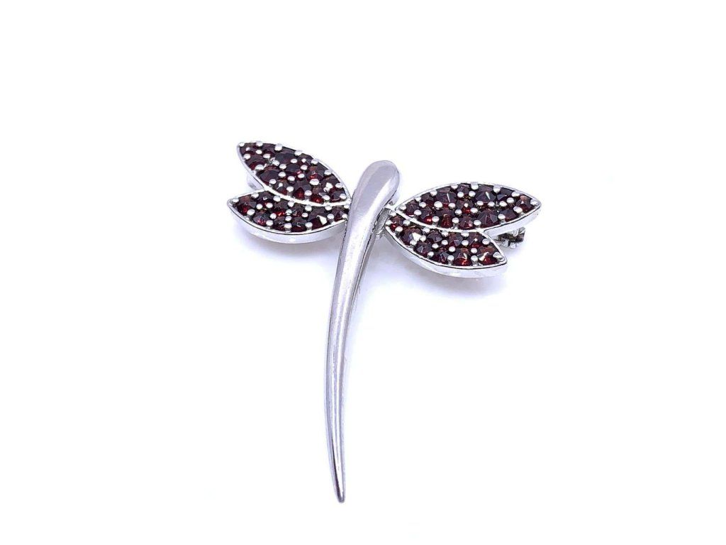 Elegantní dámská brož ze stříbra (925/1000) s Českými granáty. Brož je ve tvaru vážky, jejiíž tělo je ponecháno v hladkém provedení a křídla jsou bohatě osázená pravými Českými granáty. Pravost kamenů je doložena certifikátem o původu. Šperk je chráněn povrchovou úpravou rhodiováním, které jej chrání před oxidací. Všechno naše zboží je značeno puncovními značkami uznanými Puncovním úřadem ČR.Doplňkové parametry
