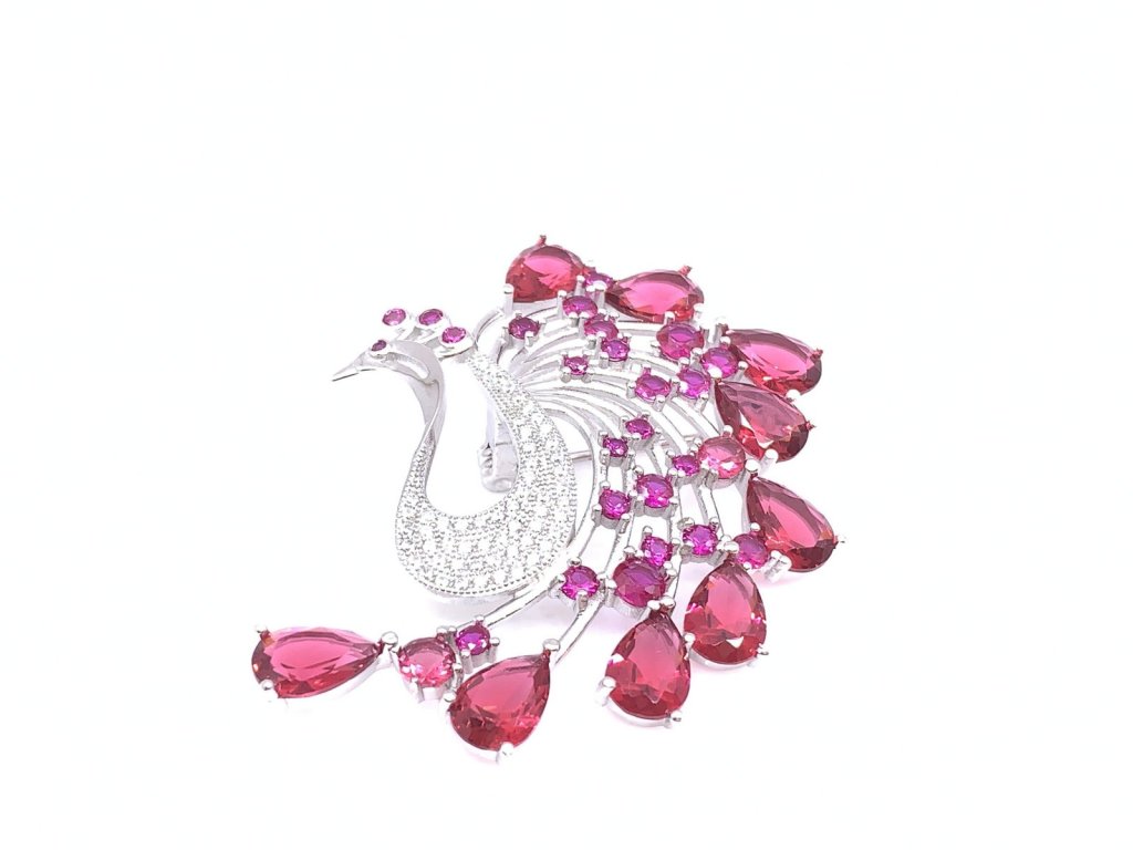 Elegantní dámská brož ze stříbra (925/1000). Brož je ve tvaru páva, který osázen bílými a červenými zirkony. Šperk je chráněn povrchovou úpravou rhodiováním, které jej chrání před oxidací. Všechno naše zboží je značeno puncovními značkami uznanými Puncovním úřadem ČR.Doplňkové parametry