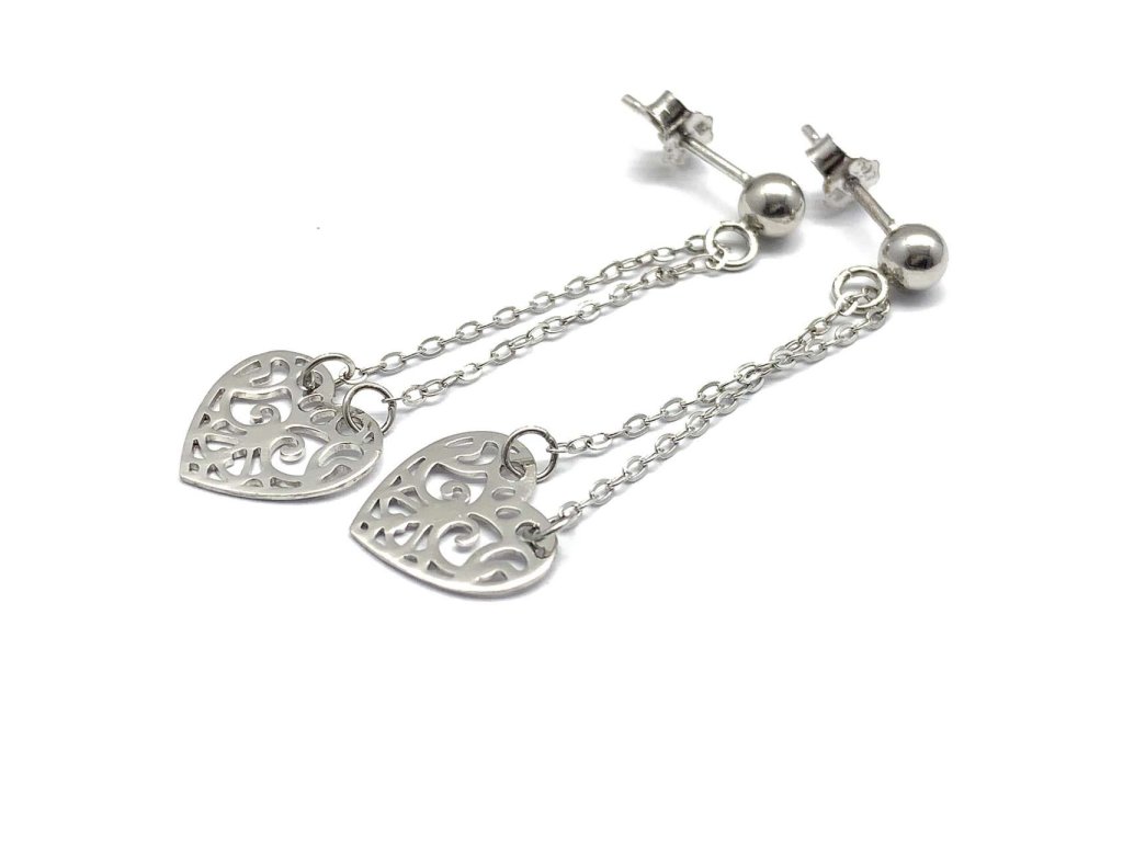 Krásné dámské náušnice ze stříbra (925/1000). Mají tvar prořezávaného srdce a jsou visací. Srdce je zavěšené na řetízku typu anker. Zapínání je na puzetu. Šperk je chráněn povrchovou úpravou rhodiováním, které jej chrání před oxidací. Všechno naše zboží je značeno puncovními značkami uznanými Puncovním úřadem ČR.Doplňkové parametry