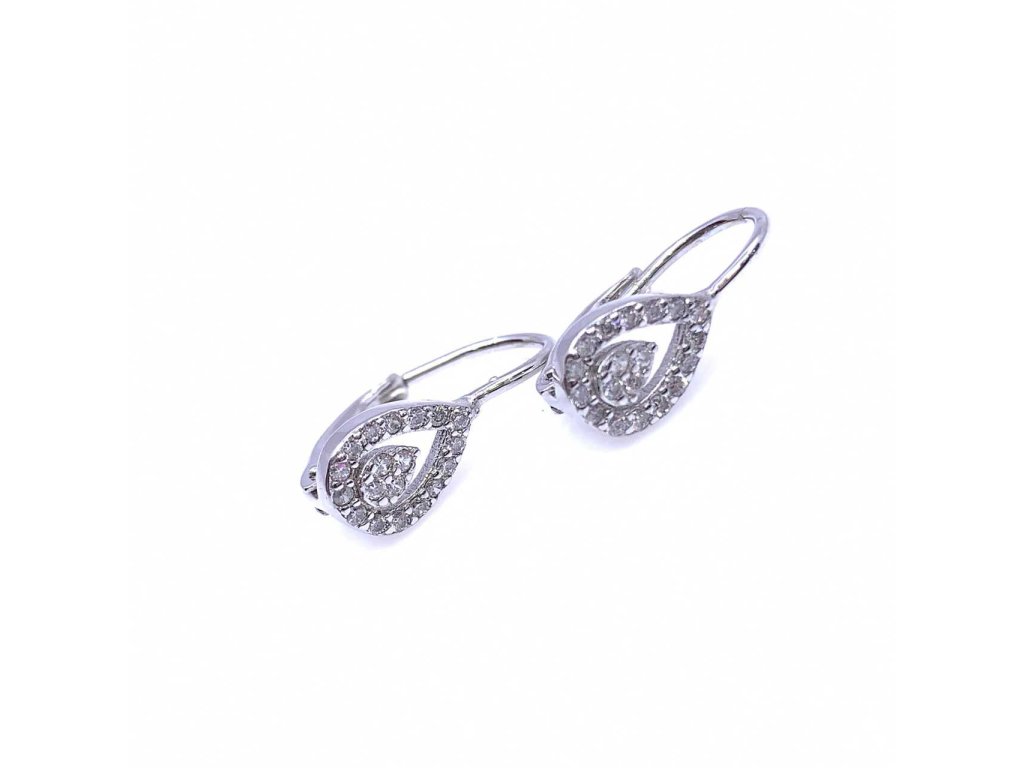 Dámské stříbrné náušnice (925/1000). Zářivé stříbrné náušnice ve tvaru kapky, která je vykládaná bílými zirkony. Uvnitř kapky je ještě jedna menší kapka, která je též vykládaná zirkony. Zapínání náušnic je na klapku. Šperk je chráněn povrchovou úpravou rhodiováním, které jej chrání před oxidací. Všechno naše zboží je označeno puncovními značkami uznanými Puncovním úřadem ČR.Doplňkové parametry