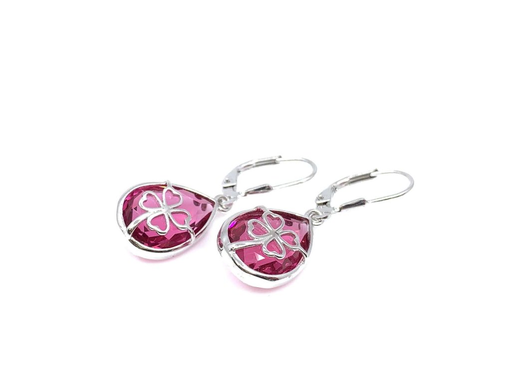 Dámské náušnice ze stříbra (925/1000). Náušnice mají tvar kapky. Ve středu je jeden centrální růžový zirkon, který má na sobě ozdobu v podobě čtyřlístku. Zapínání je na klapku a jsou visací. Šperk je chráněn povrchovou úpravou rhodiováním, které jej chrání před oxidací. Všechno naše zboží je značeno puncovními značkami uznanými Puncovním úřadem ČR.Doplňkové parametry