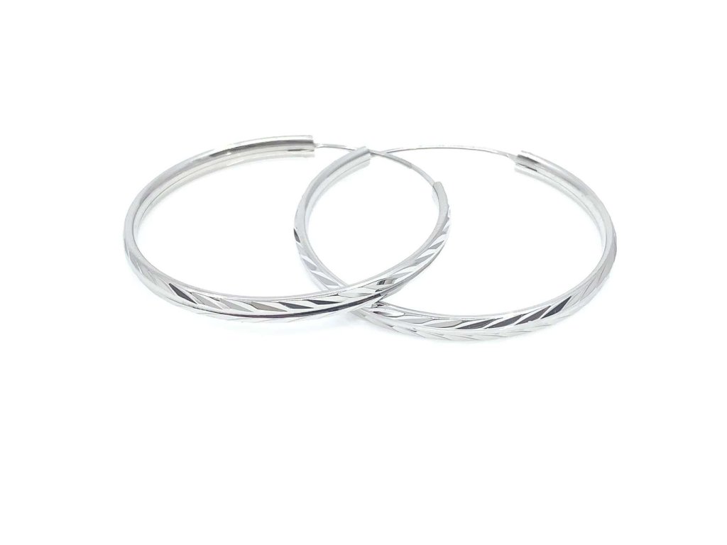 Dámské náušnice ze stříbra (925/1000). Mají tvar kruhů, které jsou zdobené broušením. Šperk je chráněn povrchovou úpravou rhodiováním, které jej chrání před oxidací. Všechno naše zboží je značeno puncovními značkami uznanými Puncovním úřadem ČR.Doplňkové parametry