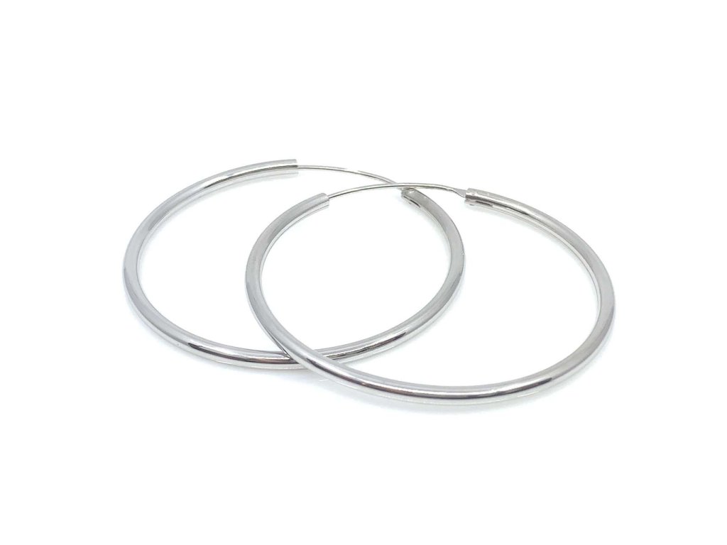 Dámské náušnice ze stříbra (925/1000). Mají tvar kruhů, které jsou hladké. Šperk je chráněn povrchovou úpravou rhodiováním, které jej chrání před oxidací. Všechno naše zboží je značeno puncovními značkami uznanými Puncovním úřadem ČR.Doplňkové parametry