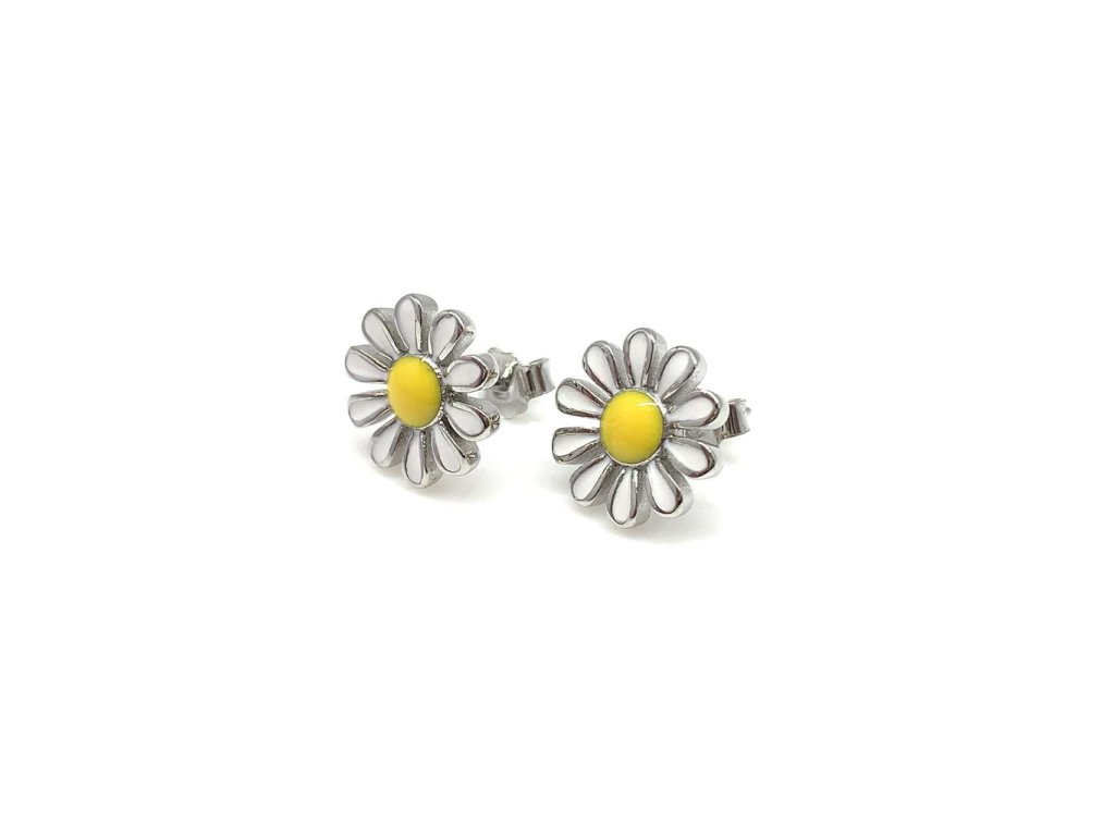 Dámské náušnice ze stříbra (925/1000). Mají tvar kytky, která je ozdobená žlutým a bílým emailem. Zapínání je na puzetu. Šperk je chráněn povrchovou úpravou rhodiováním, které jej chrání před oxidací. Všechno naše zboží je značeno puncovními značkami uznanými Puncovním úřadem ČR.Doplňkové parametry
