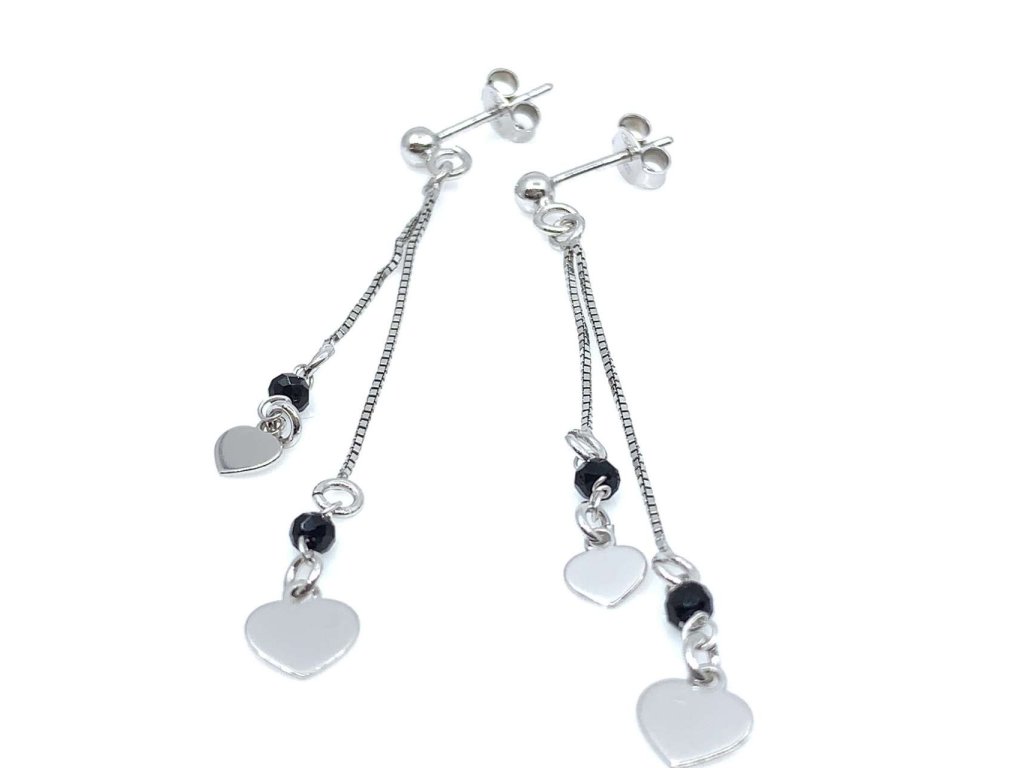 Dámské náušnice ze stříbra (925/1000) s ozdobou ve tvaru černé kuličky a srdce zavěšených na řetízku vzoru kostička. Zapínání je na puzetu a jsou visací. Šperk je chráněn povrchovou úpravou rhodiováním, které jej chrání před oxidací. Všechno naše zboží je označeno puncovními značkami uznanými Puncovním úřadem ČR.Doplňkové parametry