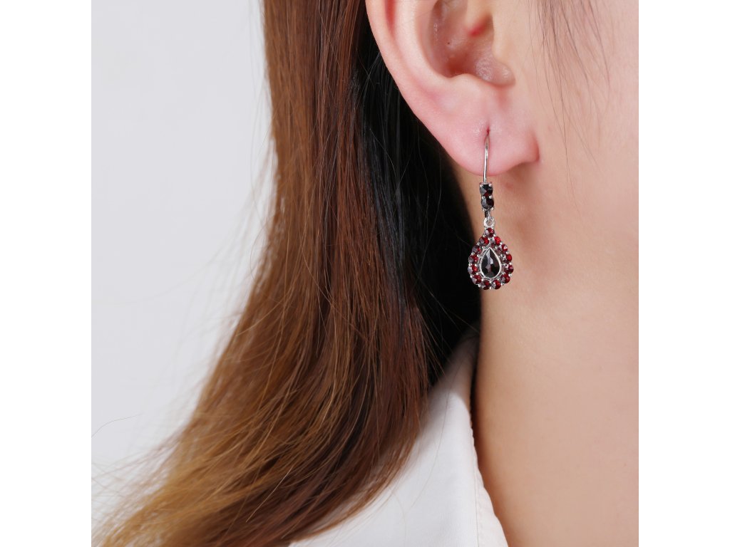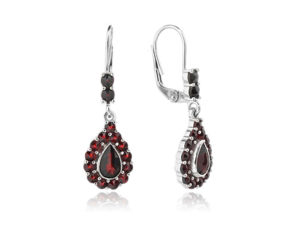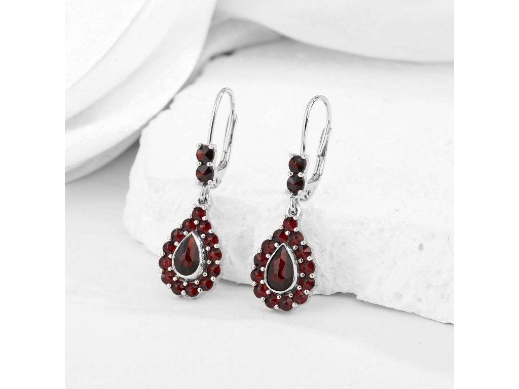 Stříbrné náušnice s Českým granátem (925/1000). Visací náušnice ve tvaru kapky. Hlavní ozdobu tvoří vetší granát zbroušený do tvaru kapky, který je lemovaný drobnými granáty. V horní části náušnice jsou dva menší granáty. Zapínání náušnic je na klapku. PořIďte si nevšední náušnice pro všední dny. Ke šperku obdržíte certifikát o pravosti kamene. Šperk je chráněn povrchovou úpravou rhodiováním, které jej chrání před oxidací. Všechno naše zboží je označeno puncovními značkami uznanými Puncovním úřadem ČR.Doplňkové parametry