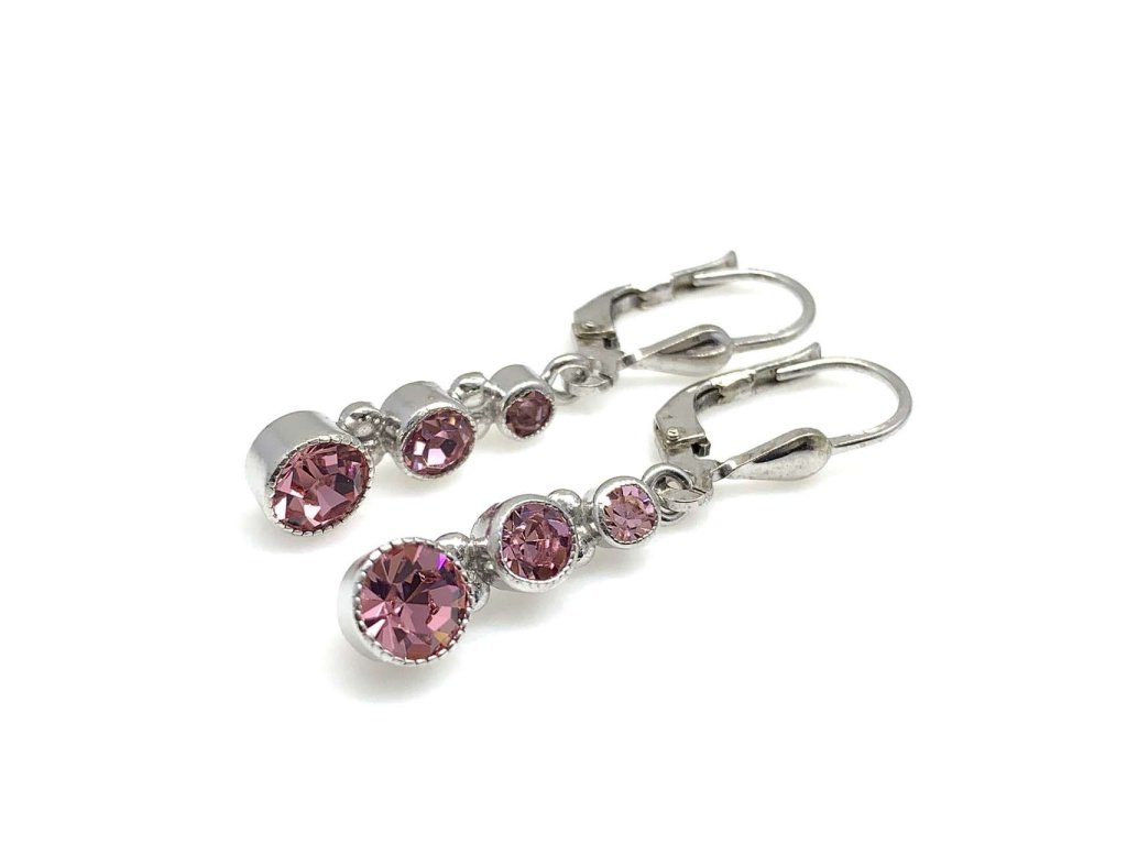 Krásné dámské náušnice ze stříbra (925/1000). Náušnice mají tvar tří koleček nad sebou, které jsou vyplněné různě velkými růžovými zirkony. Zapínání je na klapku a jsou visací. Šperk je chráněn povrchovou úpravou rhodiováním, které jej chrání před oxidací. Všechno naše zboží je značeno puncovními značkami uznanými Puncovním úřadem ČR.Doplňkové parametry