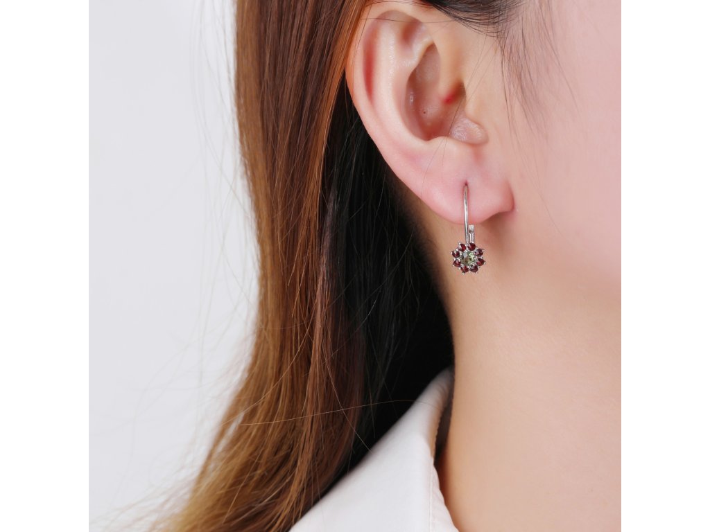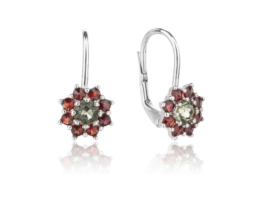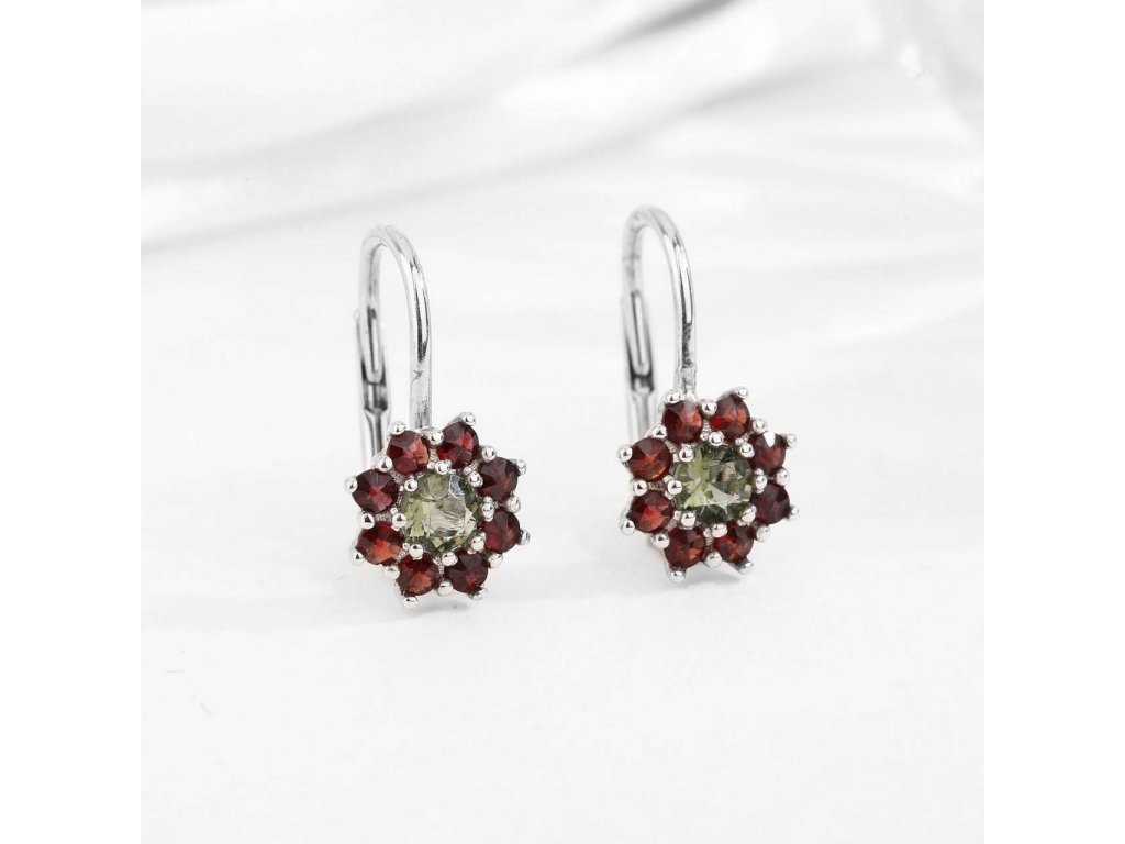 Úchvatné dámské náušnice ze stříbra (925/1000) s Českým granátem a vltavínem. Hlavní ozdobu tvoří tvar kytičky s vltavínem uprostřed, který je po svém obvodu osázen drobnými Českými granáty. Pravost kamenů je doložena certifikátem o původu. Šperk je chráněn povrchovou úpravou rhodiováním, které jej chrání před oxidací. Všechno naše zboží je značeno puncovními značkami uznanými Puncovním úřadem ČR.Doplňkové parametry