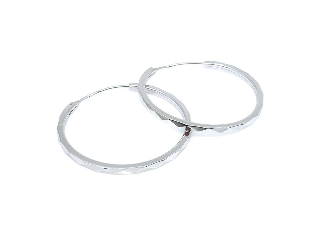 Dámské náušnice ze stříbra (925/1000). Kruhy jsou zdobené jemným broušením. Šperk je chráněn povrchovou úpravou rhodiováním, které jej chrání před oxidací. Všechno naše zboží je označeno puncovními značkami uznanými Puncovním úřadem ČR.Doplňkové parametry