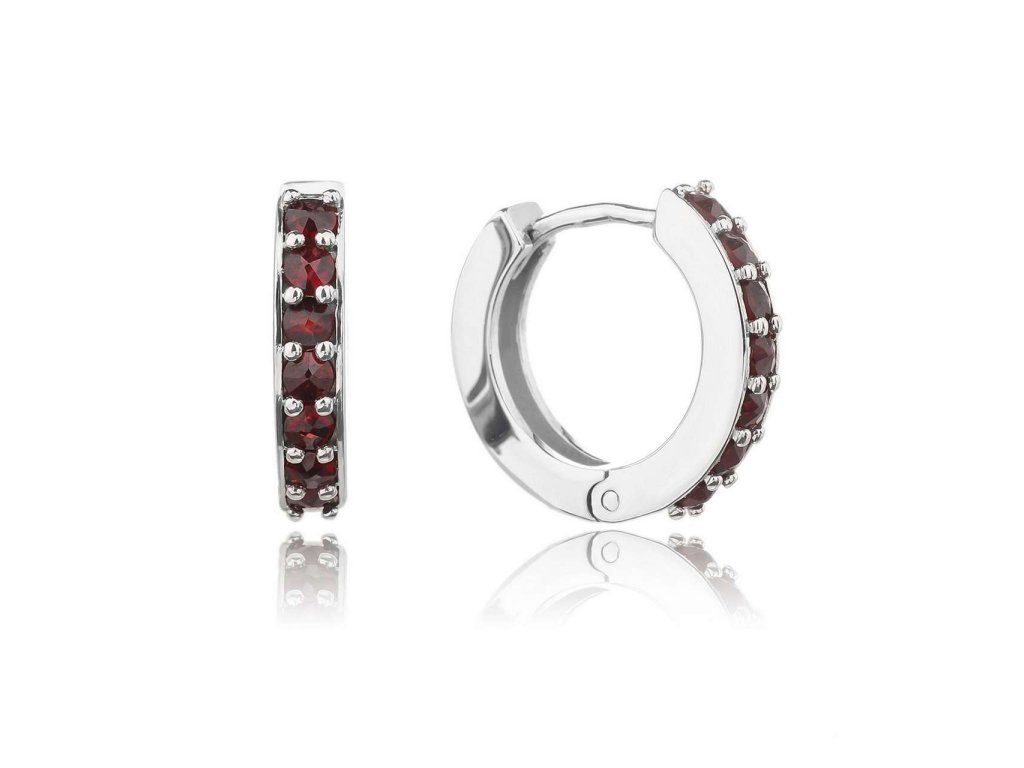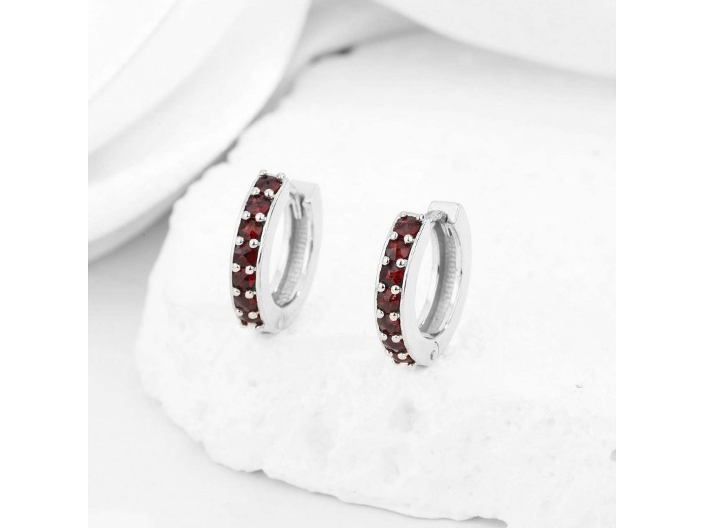 Dámské náušnice ze stříbra (925/1000) s Českým granátem. Elegantní stříbrné kroužky zdobené sedmi vsazenými granáty jistě potěší každou mladou dívku, slečnu či ženu.. Udělejte si radost a kupte si elegantní náušnice, aby Vás na každý den hezky ozdobily. Ke šperku obdržíte certifikát o pravosti kamene. Šperk je chráněn povrchovou úpravou rhodiováním, které jej chrání před oxidací. Všechno naše zboží je označeno puncovními značkami uznanými Puncovním úřadem ČR.Doplňkové parametry
