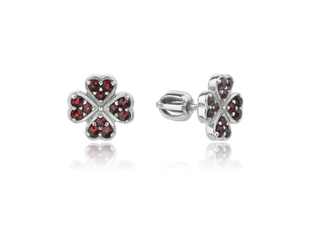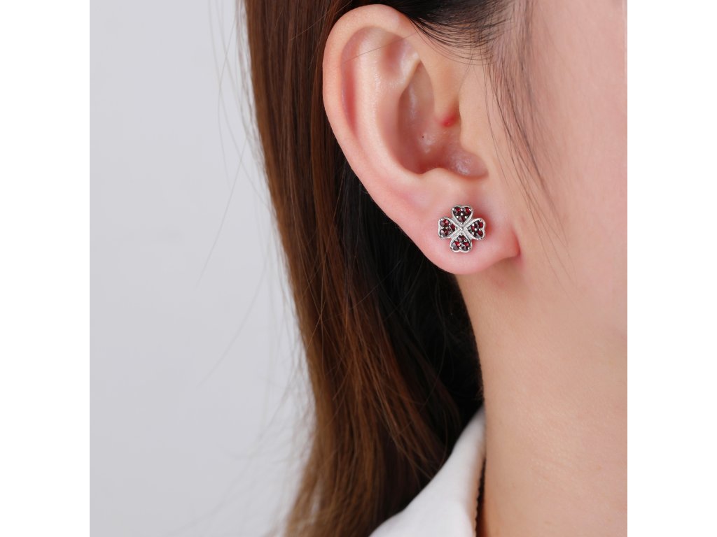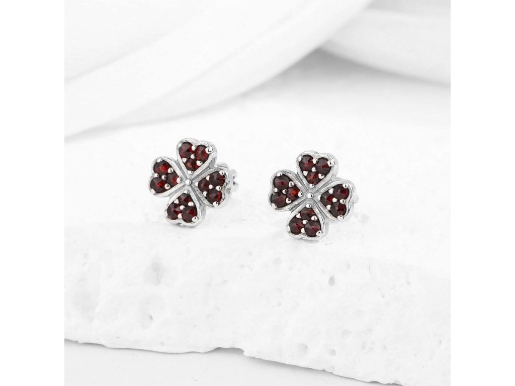 Dámské náušnice ze stříbra (925/1000). Náušnice mají tvar čtyřlístku, který je osázený Českými granáty. Zapínání je na šroubek. Ke šperku obdržíte certifikát o pravosti kamene. Šperk je chráněn povrchovou úpravou rhodiováním, které jej chrání před oxidací. Všechno naše zboží je označeno puncovními značkami uznanými Puncovním úřadem ČR.Doplňkové parametry
