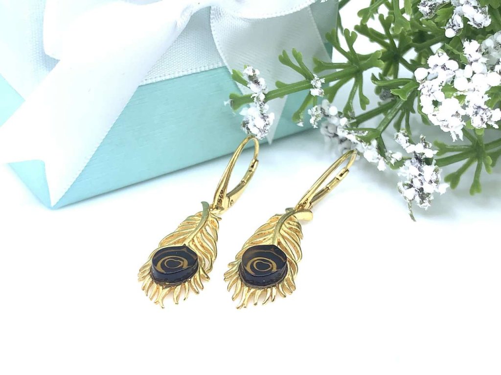 Nádherné náušnice ze zlaceného stříbra (925/1000) se závěsem v podobě pírka zdobeného tmavě hnědým jantarem. Zapínání je na klapku. Všechno naše zboží je označeno puncovními značkami uznanými Puncovním úřadem ČR.Doplňkové parametry