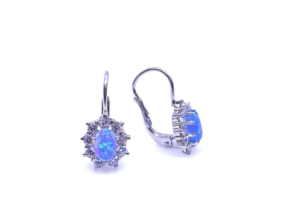 Moderní dámské naušnice ze stříbra (925/1000) potěší každou ženu. Mají oválný tvar, který je vyplněný jedním modrým syntetickým opálem a po obvodu jsou malé bílé zirkony. Zapínání je na klapku. Šperk je chráněn povrchovou úpravou rhodiováním, která jej chrání před oxidací. Všechno naše zboží je označeno puncovními značkami uznávanými Puncovním úřadem ČR.Doplňkové parametry