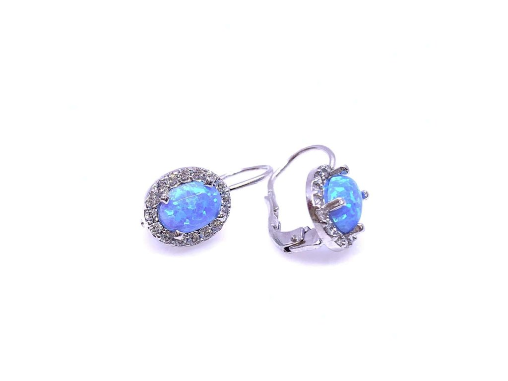 Hezké dámské náušnice ze stříbra (925/1000). Mají oválný tvar, který je osazen jedním centrálním modrým syntetickým opálem lemovaný bílými zirkony. Zapínání je na klapku. Šperk je chráněn povrchovou úpravou rhodiováním, které jej chrání před oxidací. Všechno naše zboží je značeno puncovními značkami uznanými Puncovním úřadem ČR.Doplňkové parametry