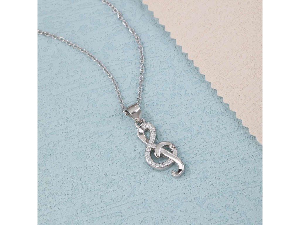 Jedinečný dámský přívěsek s řetízkem ze stříbra (925/1000) ve tvaru houslového klíče, který je v provedení velkého lesku a zdobený drobnými bílými zirkony. Řetízek je typu anker s nastavitelnou délkou. Povrchová úprava rhodiem poskytuje šperku ochranu proti oxidaci. Všechno naše zboží je označeno puncovními značkami uznanými Puncovním úřadem ČR.Doplňkové parametry