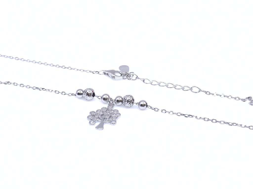 Něžný řetízek s přívěskem ze stříbra (925/1000). Přívěsek má tvar stromu života, který je osazen malými bílými zirkony. Řetízek je vzoru anker s kuličkouvou ozdobou s nastavitelnou délkou. Šperk je chráněn povrchovou úpravou rhodiováním, které jej chrání před oxidací. Všechno naše zboží je označeno puncovními značkami uznanými Puncovním úřadem ČR.Doplňkové parametry