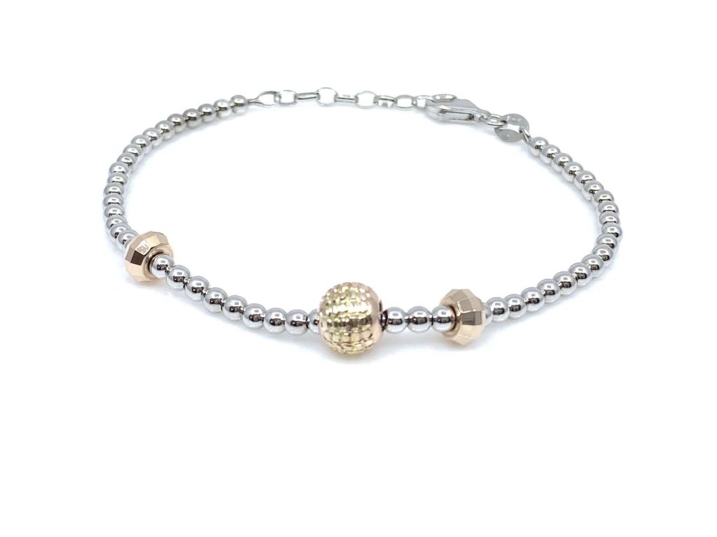 Dámský náramek ze stříbra (925/1000). Ozdoby tvoří kuličky pozlacené do barvy rose gold. Náramek je z kuliček s nastavitelnou délkou. Šperk je chráněn povrchovou úpravou rhodiováním, které jej chrání před oxidací. Všechno naše zboží je označeno puncovními značkami uznanými Puncovním úřadem ČR.Doplňkové parametry