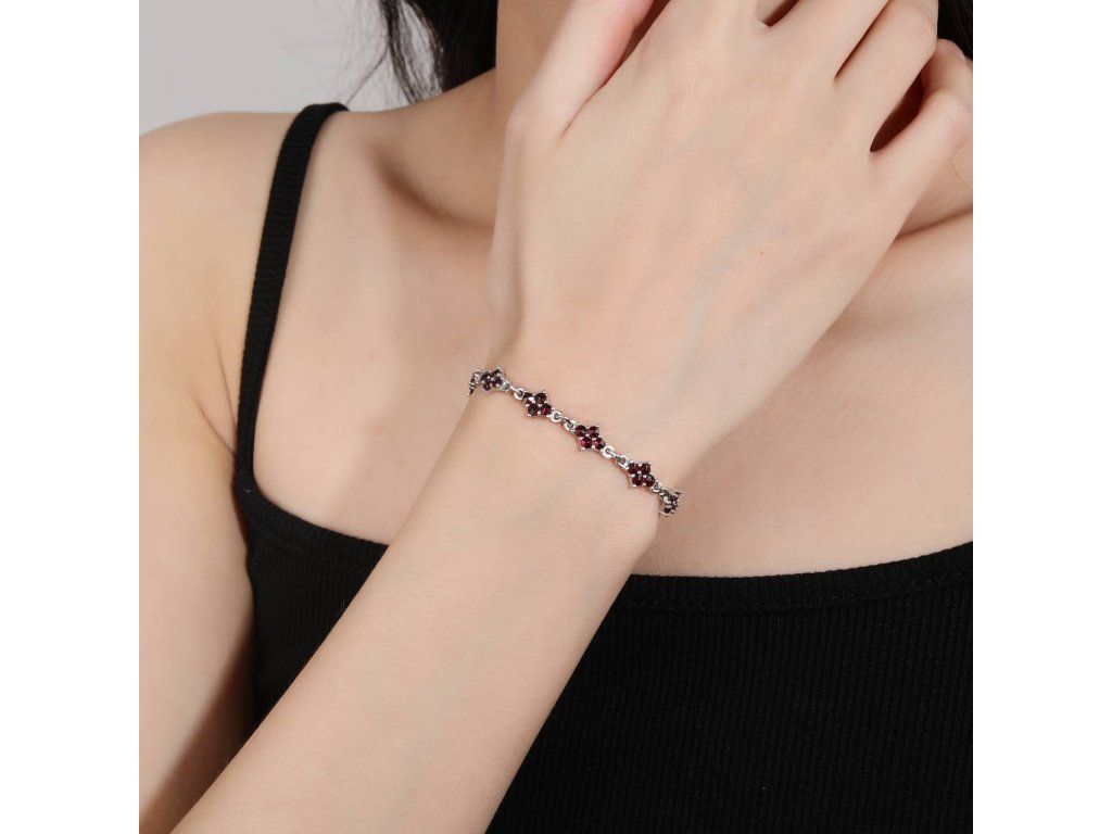 Stříbrný náramek s Českým granátem (925/1000). Máte rádi klasiku? My také a proto Vám nabízíme stříbrný náramek s typickým vzorem českých granátů. Náramek tvoří drobné kytičky vykládané rudými drahokamy. Délka náramku je nastavitelná. Ke šperku obdržíte certifikát o pravosti kamene. Šperk je chráněn povrchovou úpravou rhodiováním, které jej chrání před oxidací. Všechno naše zboží je označeno puncovními značkami uznanými Puncovním úřadem ČR.Doplňkové parametry