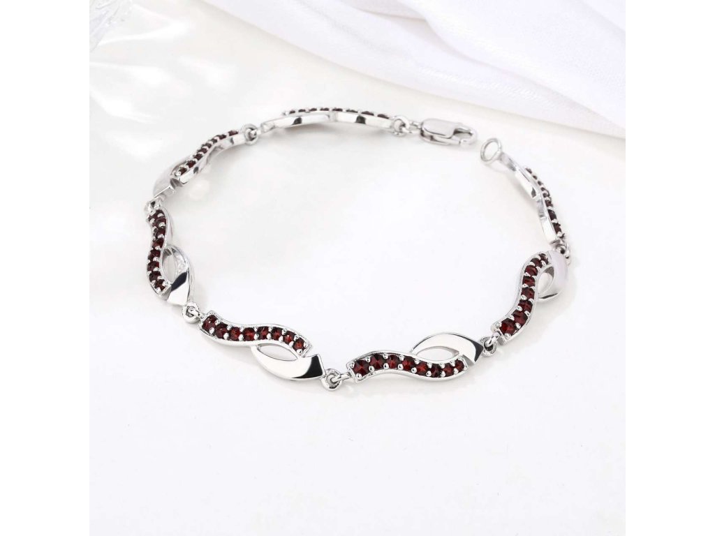 Exklutivní dámský náramek ze stříbra (925/1000) s Českými granáty. Náramek je tvořen jemnými vlnkami, které jsou zdobené vsazenými Českými granáty. Délka náramku je 18 cm. Pravost kamenů je doložena certifikátem o původu. Šperk je chráněn povrchovou úpravou rhodiováním, které jej chrání před oxidací. Všechno naše zboží je značeno puncovními značkami uznanými Puncovním úřadem ČR.Doplňkové parametry
