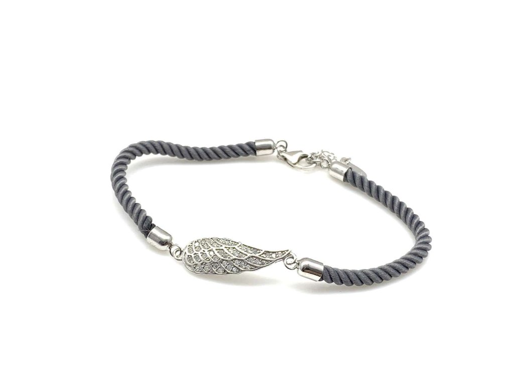 Moderní dámský náramek ze stříbra (925/1000). Typ náramku je šedý točený provázek s andělským křídlem, které je zdobené malými bílými zirkony. Délka náramku je nastavitelná. Stříbro je povrchově upraveno rhodiováním pro dlouhodobé udržení lesku. Všechno naše zboží je označeno puncovními značkami uznanými Puncovním úřadem ČR.Doplňkové parametry